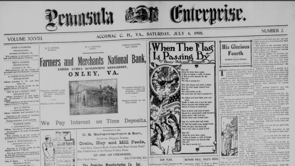While doing fieldwork on Lower Delmarva, I recently needed access to Eastern Shore of Virginia newspapers. Specifically, I wanted the Peninsula Enterprise, an Accomac, Northampton County, VA weekly. My first step, a Google query took, me to the Library of Virginia, which has created word searchable, e-copies of this serial, spanning the years 1881 to 1910.